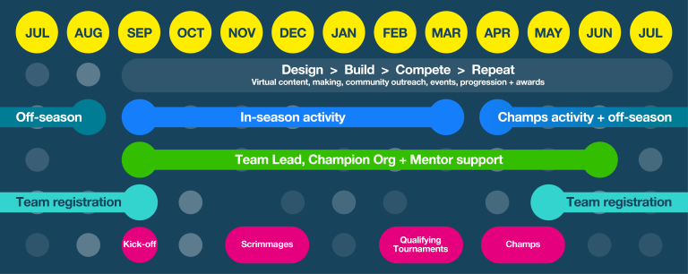 Explore the tabs below to understand each stage of the season and the events your team will participate in. Between each phase, teams are busy working away on their robots, fundraising, doing outreach and more.